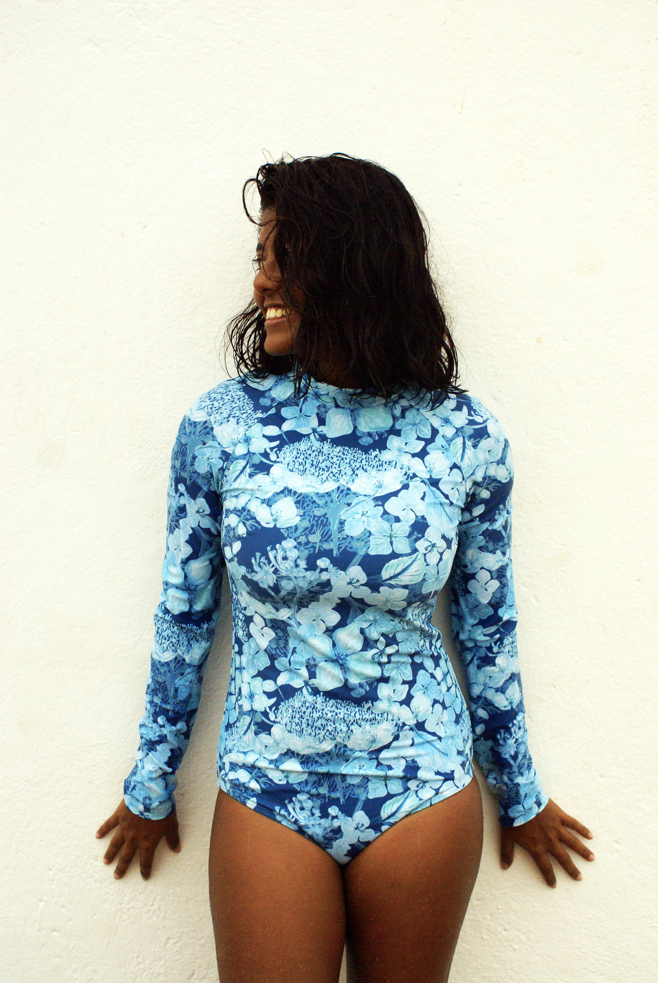 This gorgeous blue Hydrangea print Long Sleeve Swimsuit is designed for comfort, shaping, and standout style. Built to help you move through the water like a pro, this long sleeve suit has bum coverage, a back zip for easy on and off, and long sleeves ideal for warm water sessions that last from sunrise to sunset.