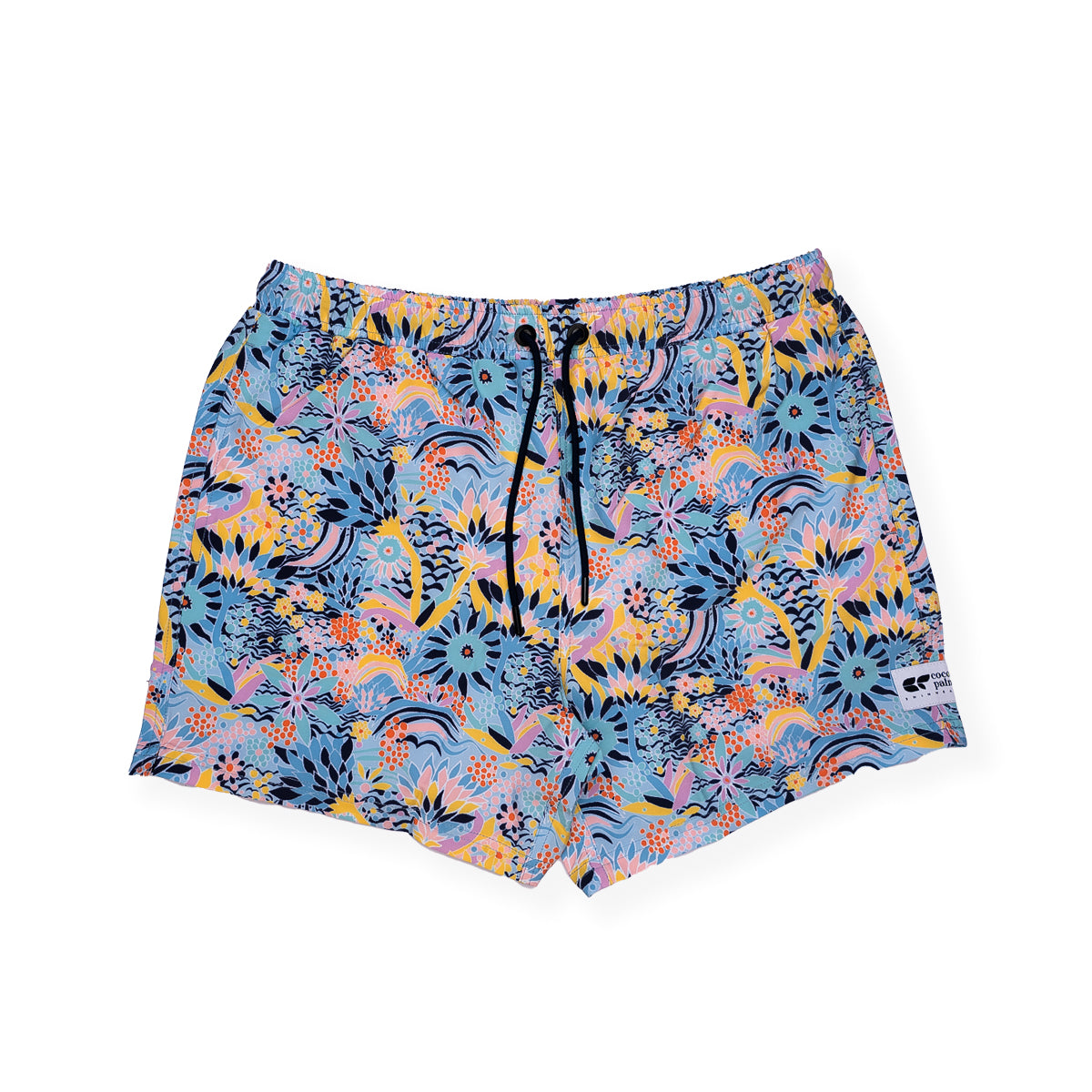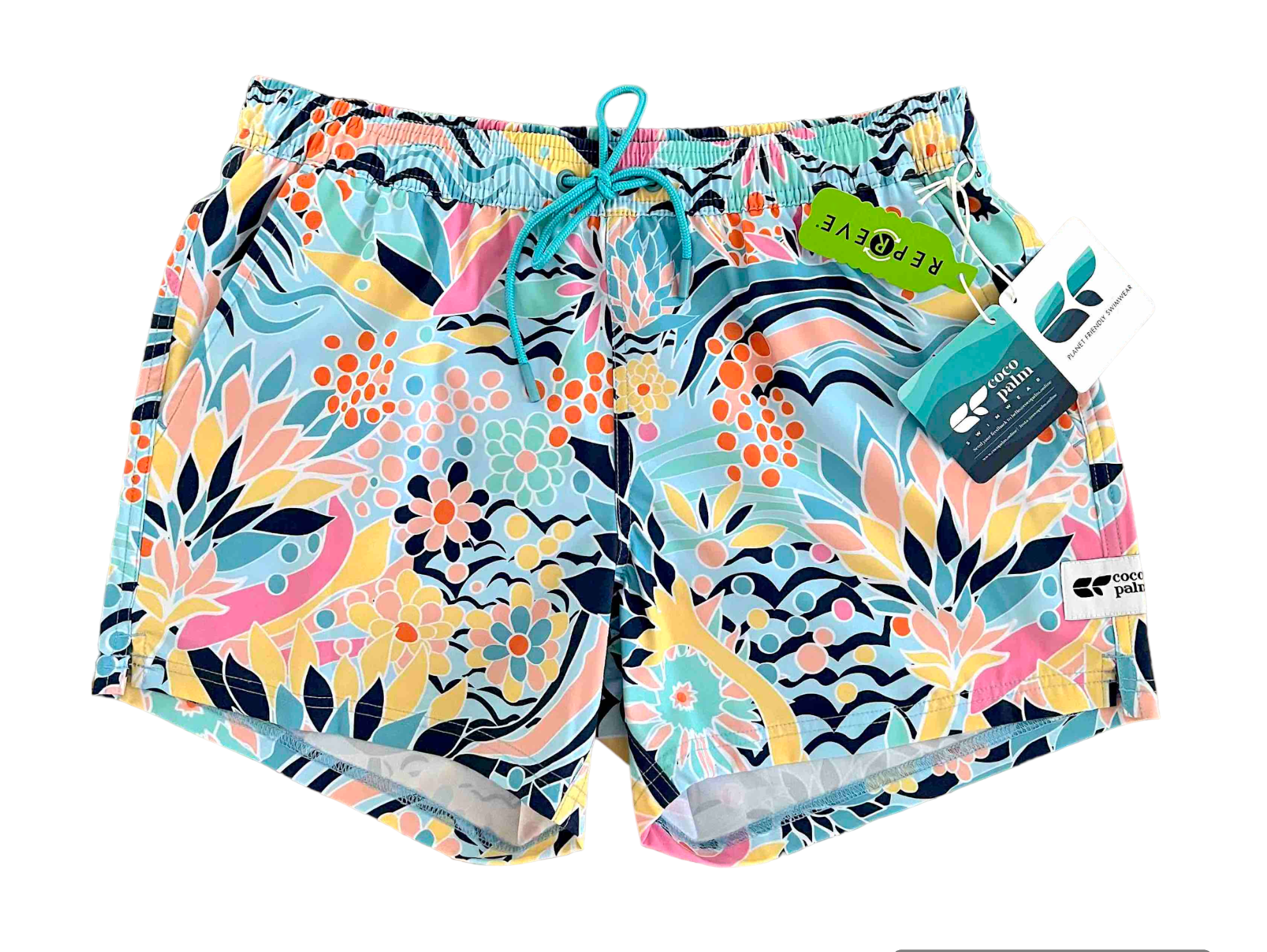 The print is a whimsical tropical reef print in soothing and relaxing pastel shades. Mesh side pockets enable water to drain quickly, and a mesh back for stashing your valuables when you're in the surf (or anywhere really!) and an elastic waist lets you fine-tune your fit for the surf or street,